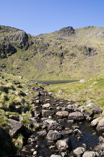 | Once over Rossett Pike, the view down to Angle Tarn |